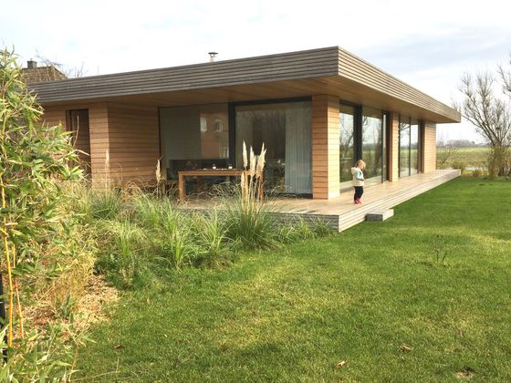 Auf 140 m2 Wohnfläche bietet der 2017 fertiggestellte Holzbungalow mit großem Wohn- und Küchenbereich,