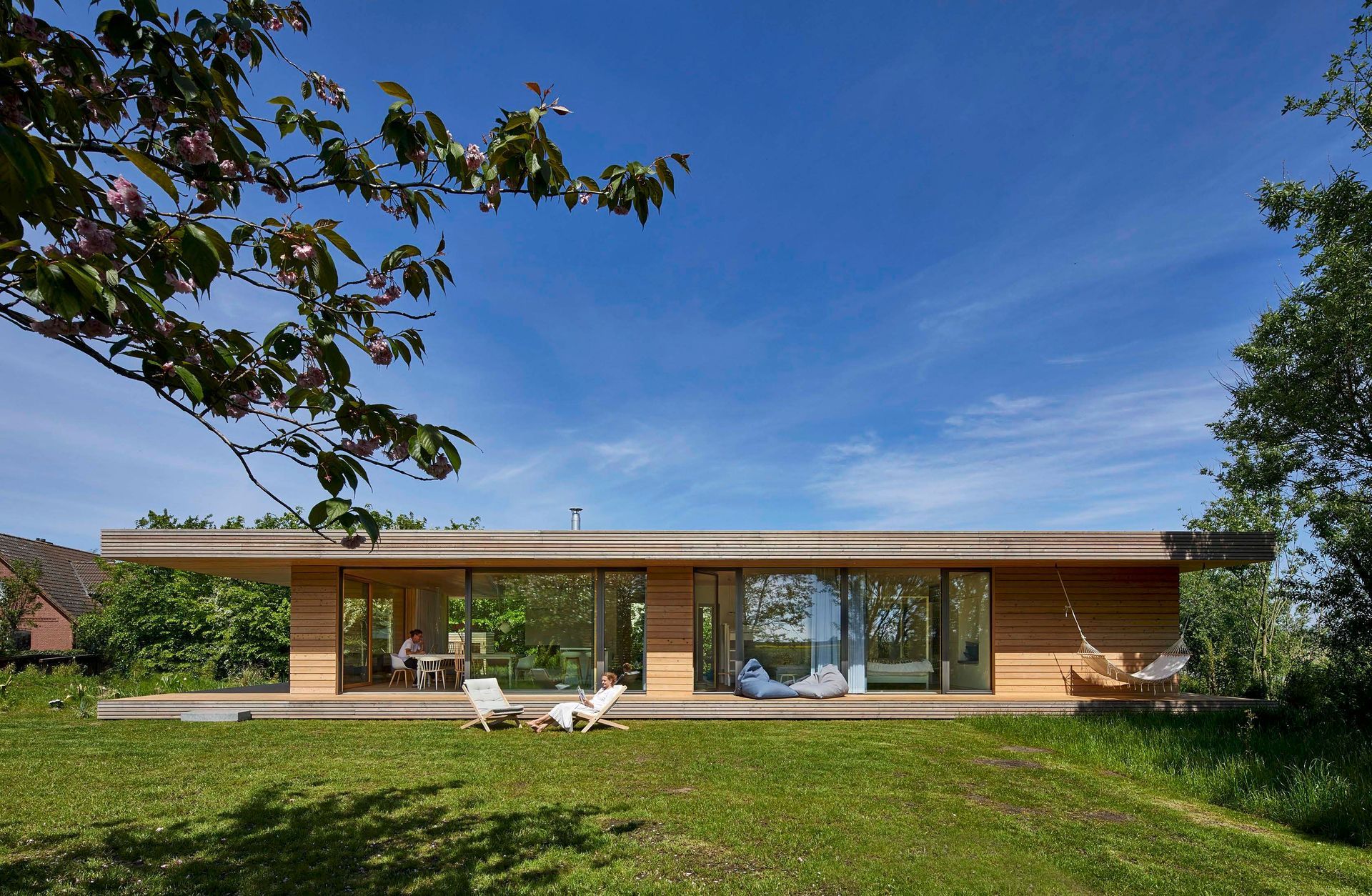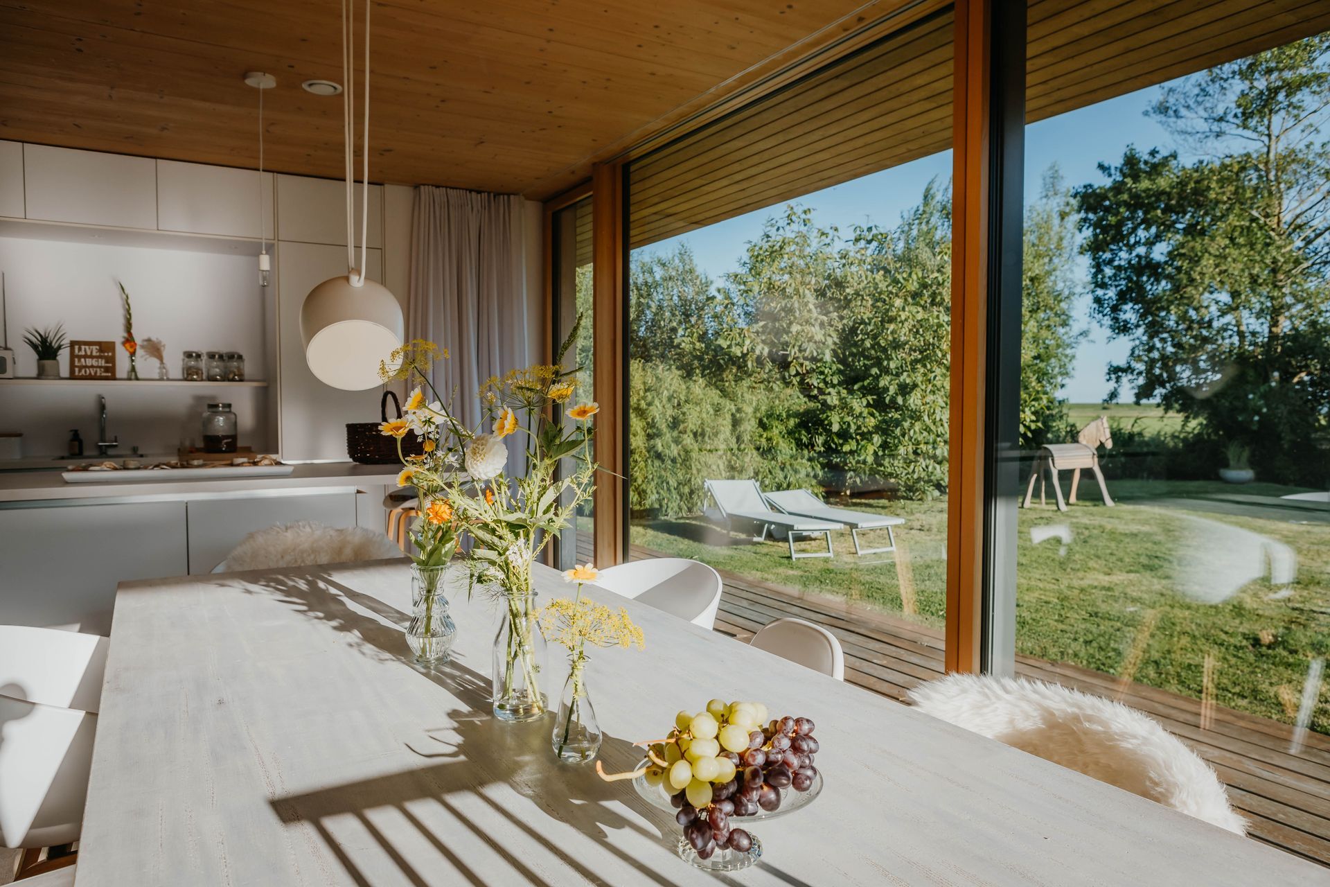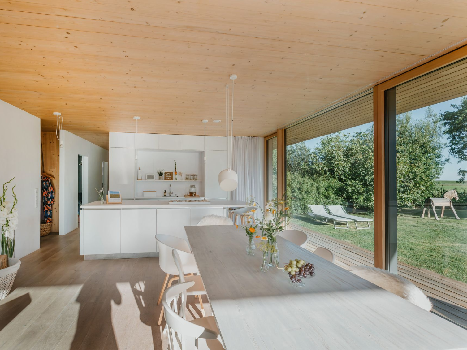 Große bodentiefe Fenster in allen Räumen bringen viel Licht ins Haus und öffnen sich gleichzeitig zur weiten Landschaft mit Blick bis zum Deich & verbinden den Garten, Natur und die umlaufende Terrasse mit dem Innenraum.