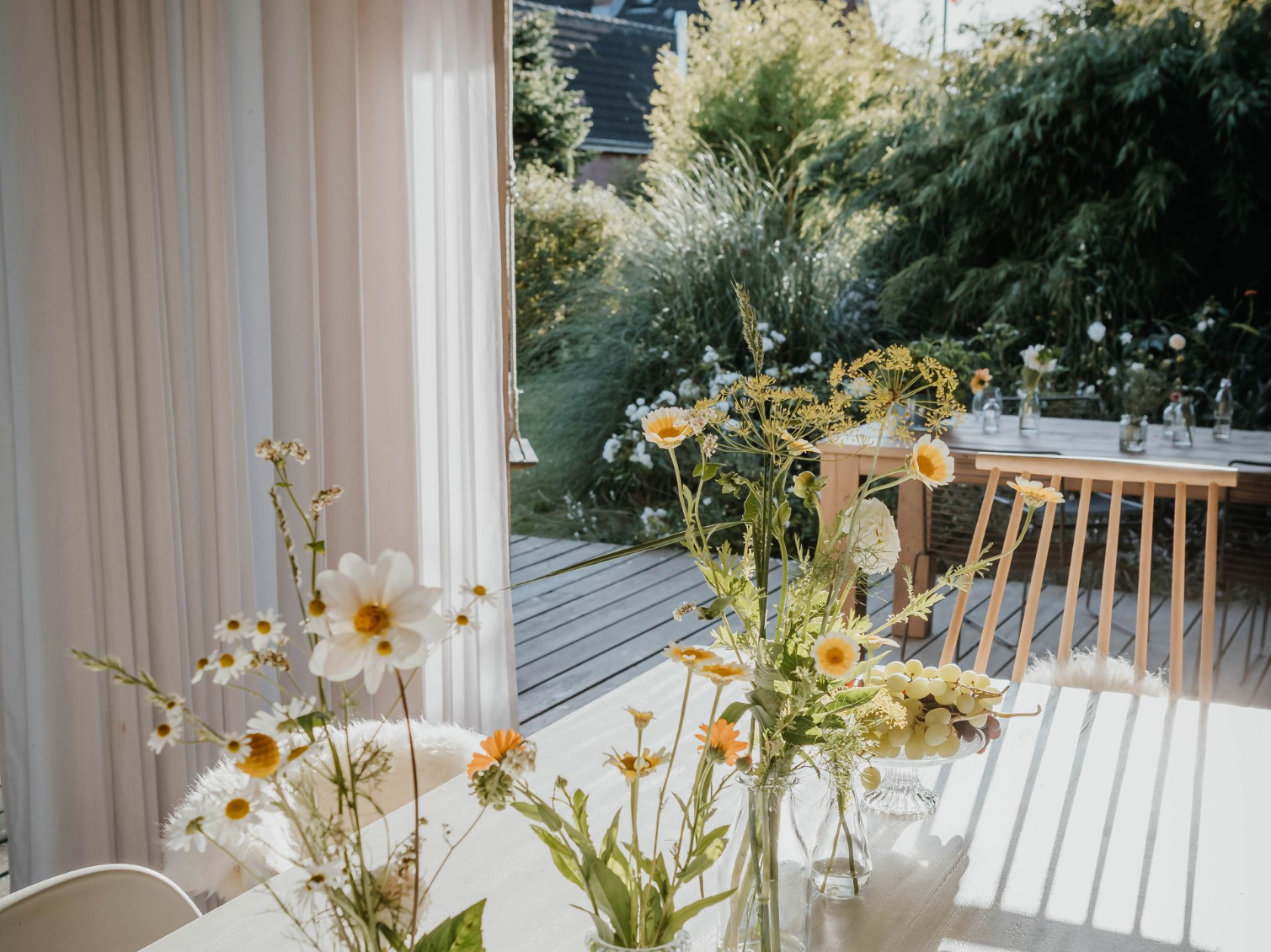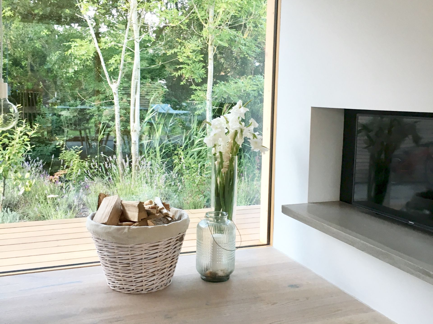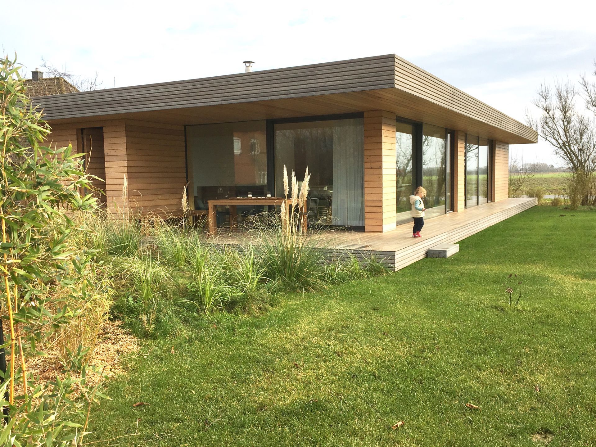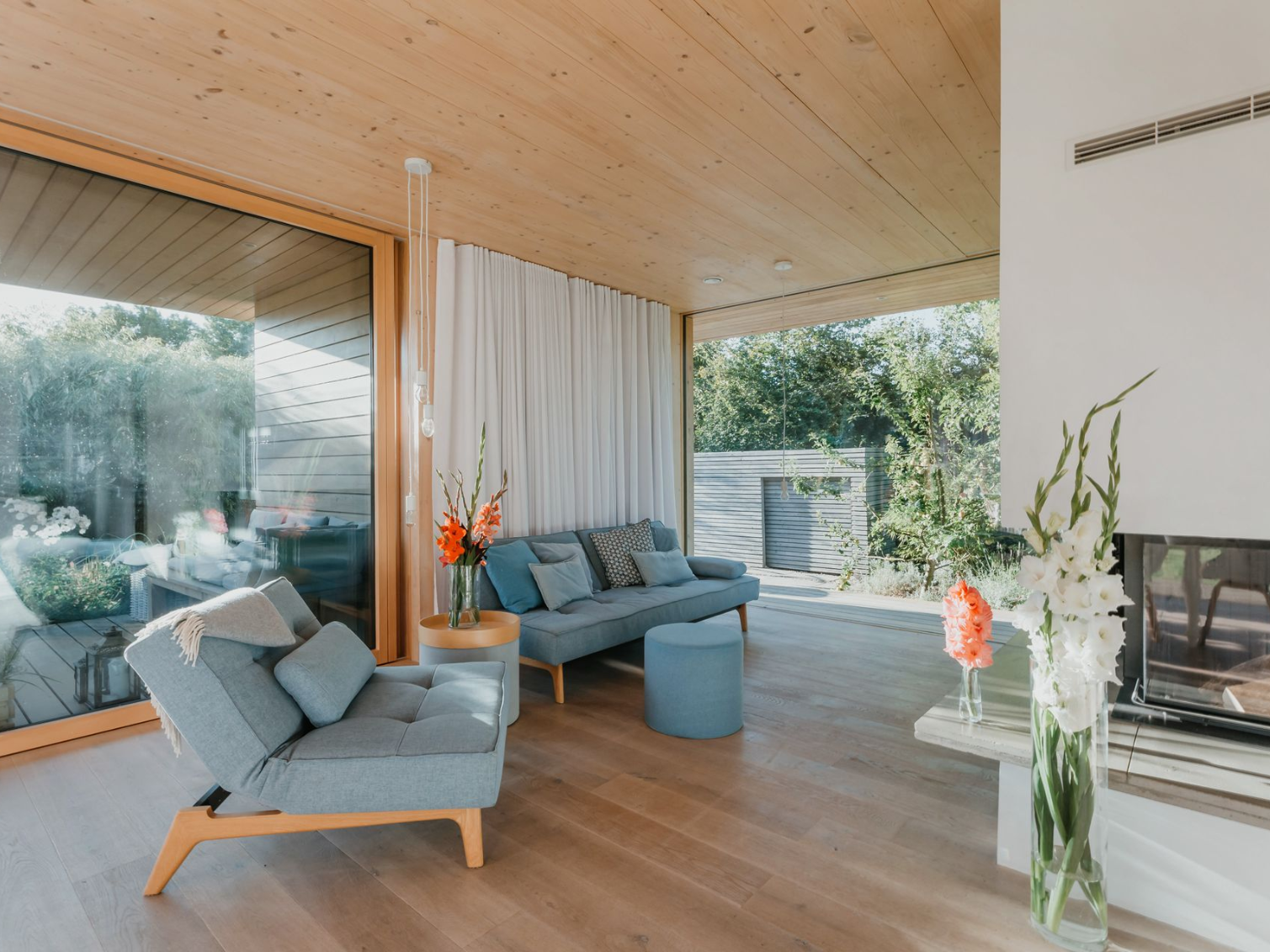 Große bodentiefe Fenster in allen Räumen bringen viel Licht ins Haus und öffnen sich gleichzeitig zur weiten Landschaft mit Blick bis zum Deich & verbinden den Garten, Natur und die umlaufende Terrasse mit dem Innenraum.