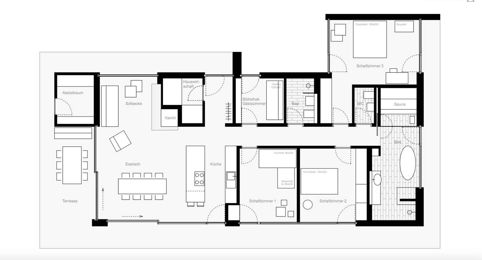 Als Rückzugsorte stehen zwei Schlaf-/Kinderzimmer mit je ca. 15qm, ein großes Schlafzimmer mit ca. 20qm, Schreibtisch, Babybett und einem weiteren Fernseher mit DVD Player sowie ein kleines Gäste-/Arbeitszimmer zur Verfügung.