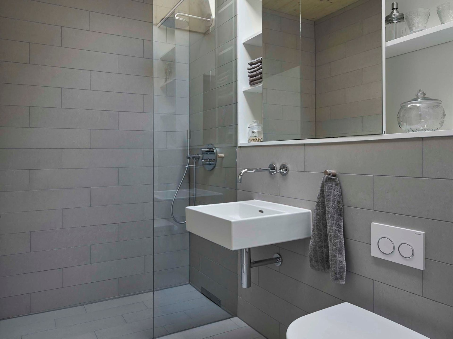 Ein großes Badezimmer mit Sauna, freistehender Badewanne, Dusche und Waschtisch - ein keines Badezimmer mit Dusche, WC und Waschtisch - sowie ein separates WC erlauben Privatheit auch mit vielen Bewohnern.